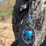Hand tooled sterling silver and copper with American Turquoise pendant. Comes complete with silver chain. Limited Edition, Purchase yours while supplies last.